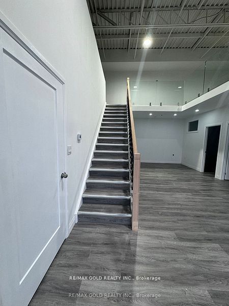 Unit allows auto repair/auto body shop use and features glass-front windows with excellent exposure. The space includes three private glass offices, a welcoming lobby area, kitchen, 2 washroom, and additional upper-level workstation space. Steel ramp installed for automotive use.Boasting 18 ft clear ceiling height and a column-free layout, the unit offers excellent functionality for a variety of uses, including warehousing, light manufacturing, kitchen cabinet manufacturing, and other permitted industrial/commercial uses.