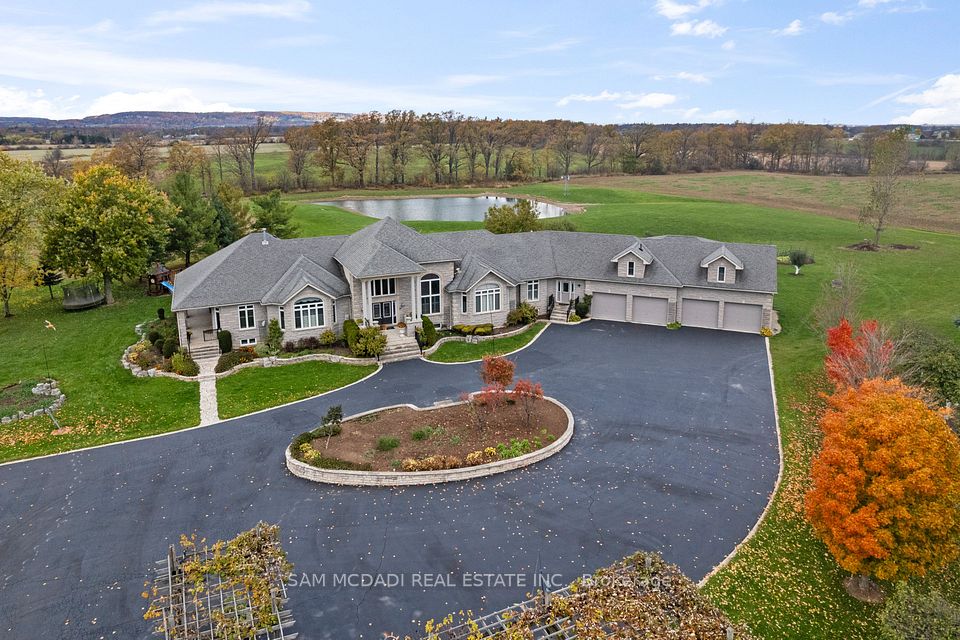 Welcome to 5431 Appleby Line, a sprawling 87-acre estate and one of the few remaining large parcels in Rural Burlington outside the Niagara Escarpment Protection Area. Offering road access from both Appleby Line and Bell School Line, the land is flat, mostly cleared, and highly functional. Just minutes to city amenities, you're 15 minutes to downtown Burlington, 20 minutes to Oakville, and under 30 minutes to Toronto Pearson International Airport. Zoned RA, the property permits equestrian operations, veterinary services, boutique farming, and select agri-tourism uses. Its scale and location support immediate lifestyle or business pursuits while offering strong long-term land-banking potential. As regional planning evolves and infrastructure expands, properties of this size and positioning may become increasingly rare and valuable. With close proximity to Burlington Airpark, the CN Intermodal Yard, and major highways including the 407, with connections to the 403/401 and QEW, this is a rare opportunity to secure an exceptional land asset in a corridor of ongoing growth and infrastructure investment. Surrounded by Mount Nemo Conservation Area, prestigious golf courses, seasonal camps, and renowned equestrian centres, the estate offers an immersive countryside lifestyle. The grounds include three scenic ponds, a large work shed, and expansive open space ideal for vision-driven owners. A custom-built 9,300+ SF residence sits at the heart of the property, offering five bedrooms, six bathrooms, soaring ceilings, a chef's kitchen, and a walk-out lower level with second kitchen, bar, gym, and recreation space, ideal for multi-generational living or entertaining. Outdoors, a 19-foot custom entry gate, mature landscaping, and a saltwater pool with stone waterfall complete the setting, transforming the property into a private, resort-style sanctuary. A legacy property that blends location, lifestyle and offers long-term value and enduring appeal.
