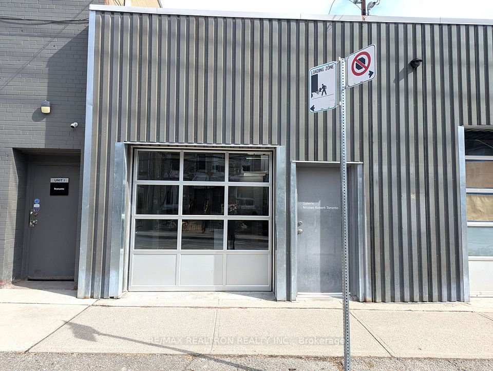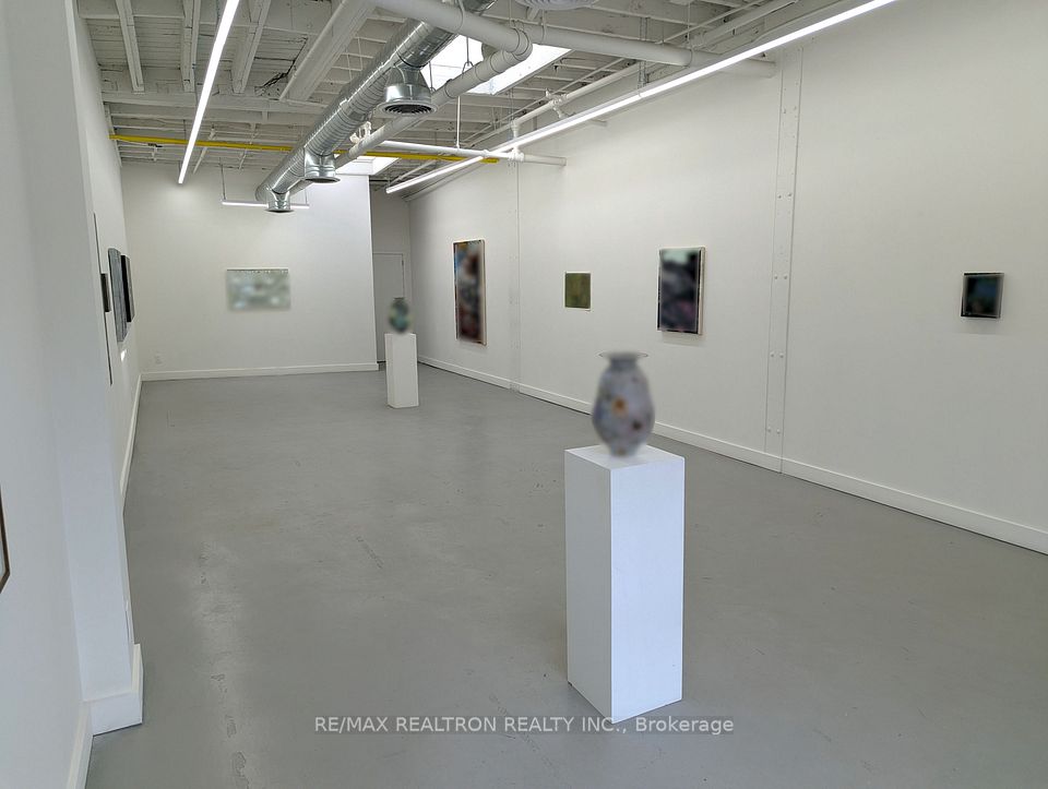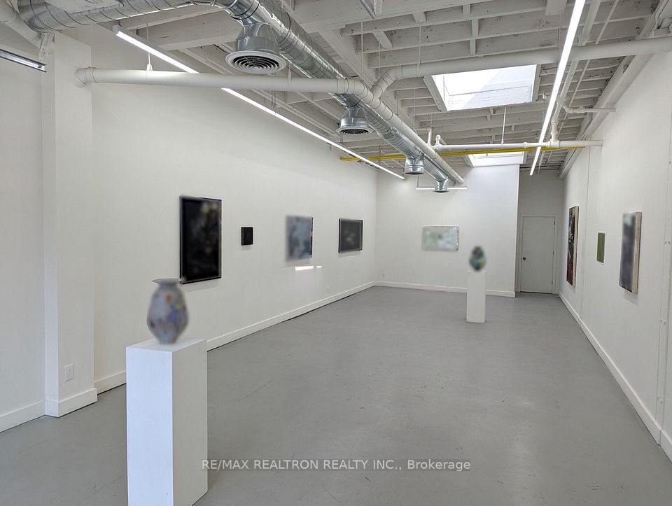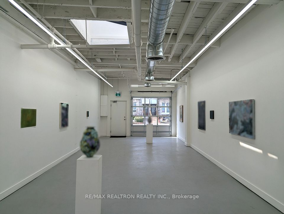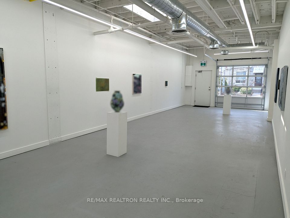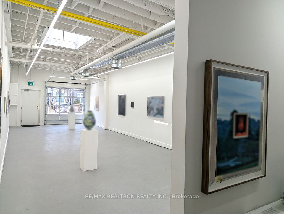 Spectacular open concept commercial retail studio space with 11 foot ceilings. Fronting directly on Tecumseth St with a private entrance. Super bright space with garage bay door and 2 skylights. White walls and grey painted concrete floors. Completely renovated with new lights, 2-piece bathroom, and small kitchenette with bar fridge. Perfect for an art gallery, tech company, or marketing group. Professional ownership and onsite property management. Gross lease with individual controls for heat and air conditioning. Gas and hydro extra. See floor plan.