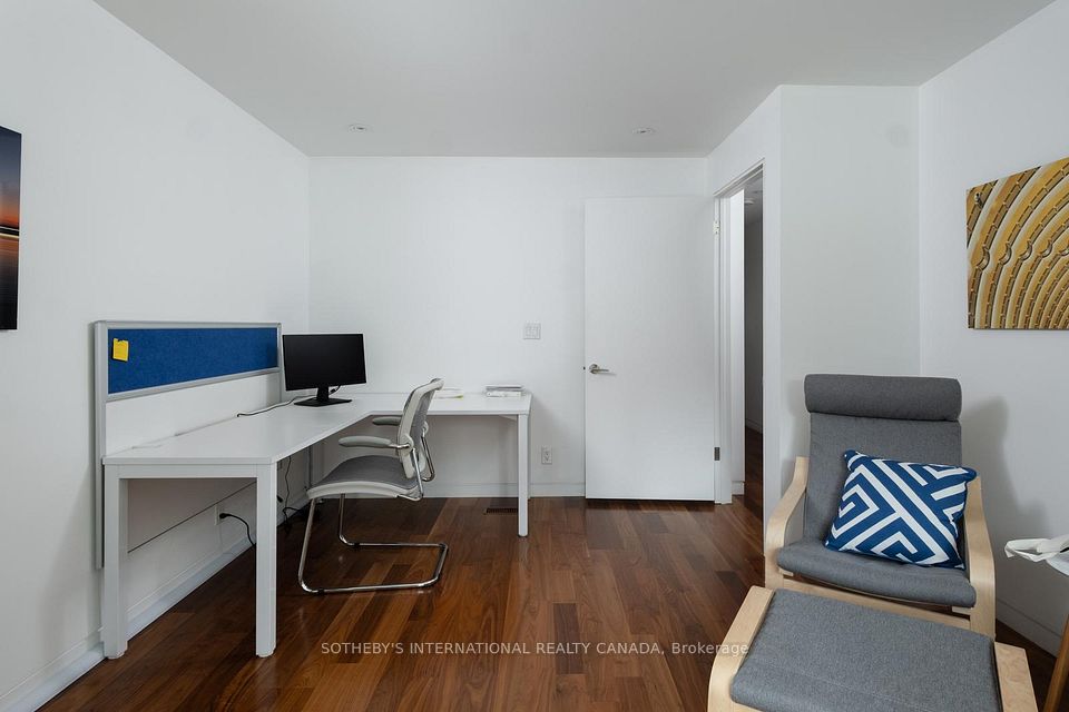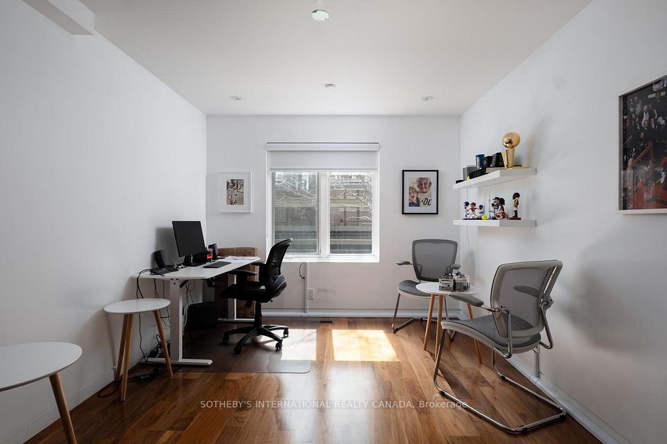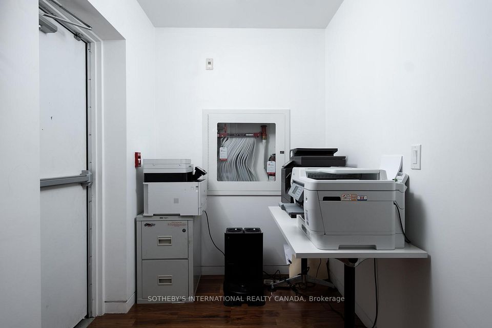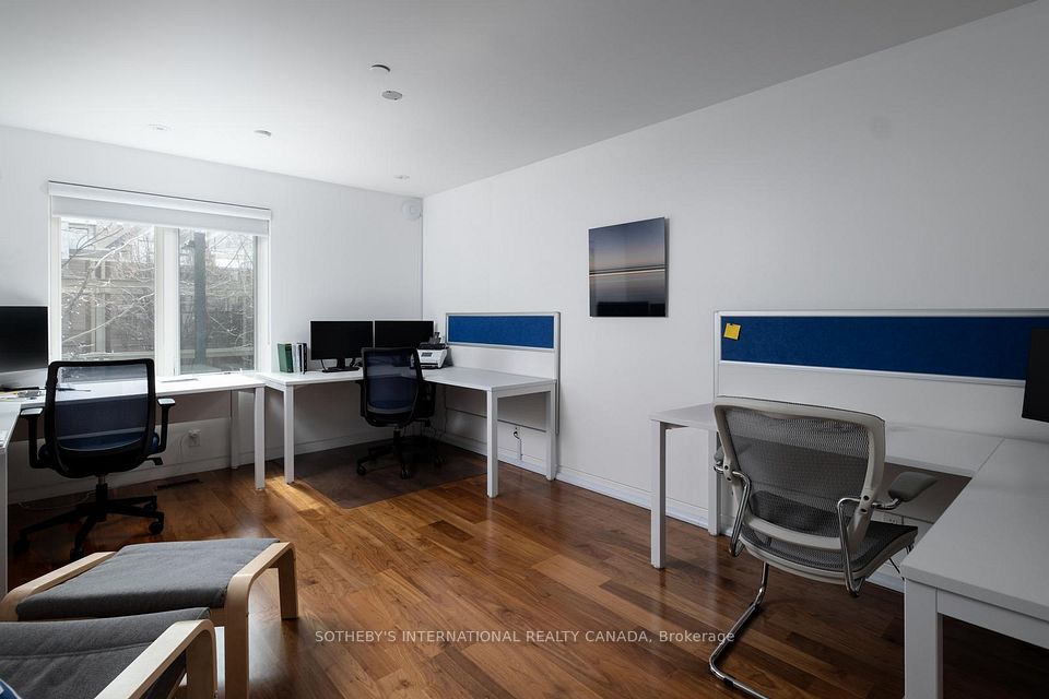 Positioned above Scollard Street, this second-floor office suite is shaped by proportion, light, and discretion. Comprising 1,578 square feet, the principal area unfolds as an open workspace anchored by a linear gas fireplace and a full-height glass wall that extends outward to a private terrace. Two enclosed offices with south exposure provide natural light and the privacy required for focused work or client-facing meetings. A streamlined kitchen with integrated Miele appliances supports extended daily use, complemented by two complete bathrooms. Dark walnut hardwood runs throughout, grounding the space against a restrained palette of white surfaces and clean architectural lines, reflecting an elevated level of finish. Set above the street, the suite maintains a quiet separation from the activity below while preserving a visual connection to its surroundings. The building presents a distinct architectural composition. A Victorian frontage, articulated with a pointed gable and timber detailing, is set in direct contrast with a modern volume expressed in glass, stone, and steel. The contrast is deliberate, reflecting the layered evolution of the street. Just north of Bloor, Scollard Street occupies a quieter position within Yorkville's established fabric, defined by heritage facades and a measured rhythm of movement. The surrounding retail, hospitality, and commercial presence remains within close reach, anchoring the neighbourhood. For practices that value proximity without exposure, and a space that supports both presence and discretion, the suite offers a composed and private working environment suited to professional, advisory, and practice-based use.