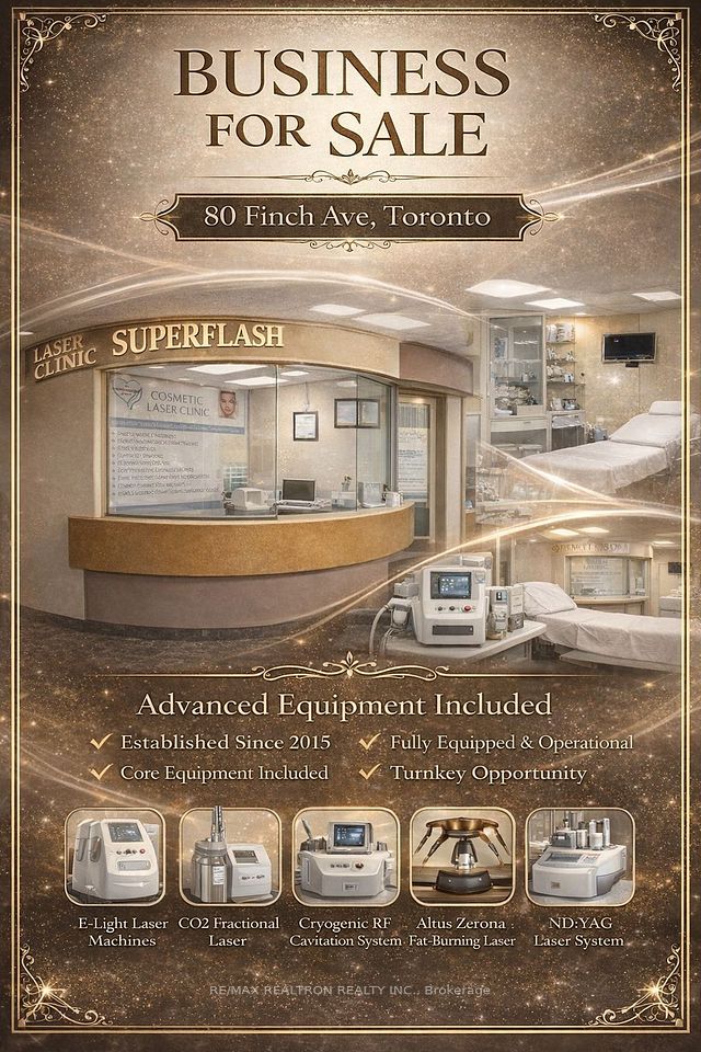 Turnkey, fully licensed medical aesthetic clinic for sale in prime Yonge & Finch location. Established since 2015 with existing clientele, strong visibility, and easy transit access. Low long-term rent and cheap insurance. Clinic is 100% debt-free - all machines and equipment are fully paid off (no loans, no leases). Includes advanced, radiation-free laser and body-contouring technology, CO2 fractional laser, ND:YAG + SHR system, Zerona fat-burning laser, RF cavitation, E-light systems, and extensive cosmetic equipment. Fully operational with reception area, security system, payment systems, website, established phone number, and client files. Immediate income from Day One. 2 weeks of training and certification included, covering machine operation and low-cost maintenance. Ideal for medical professionals, aesthetic practitioners, or investors seeking a turnkey, cash-flow business in a high-demand location. Business Name: SuperFlashLaserClinic Inc. Sale of Assets and goodwill, See attachment .