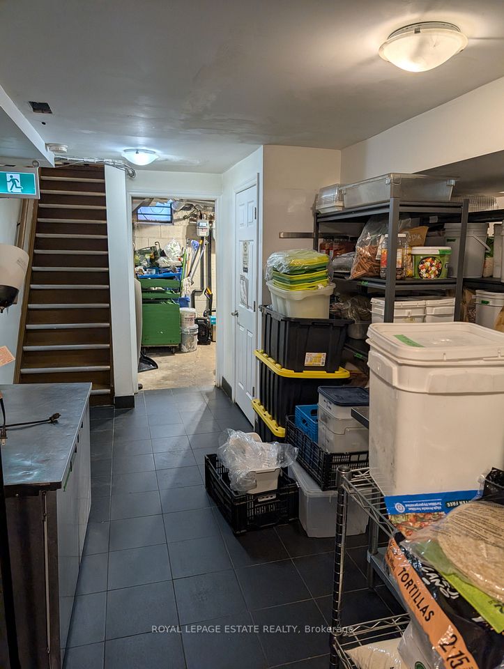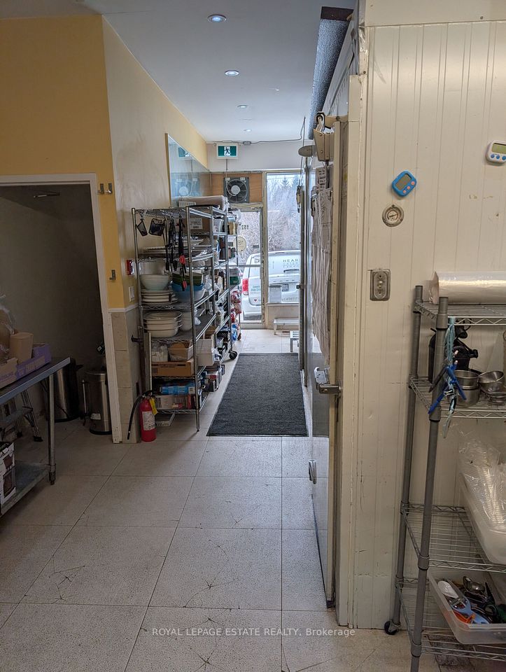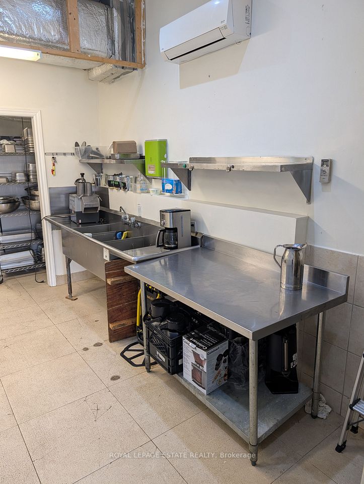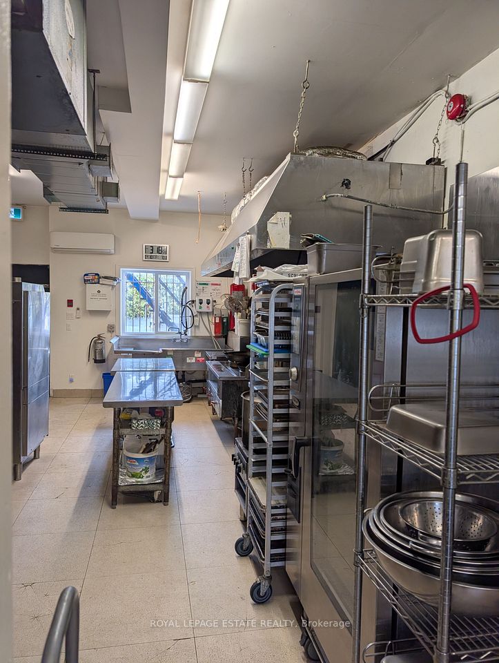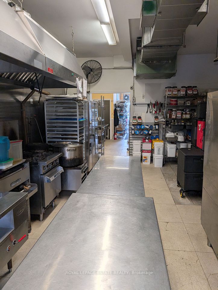 8 parking spaces, 600V 3-phase electrical, improved water intake, corner exposure and a well designed commercial kitchen make this building a caterers dream. Imagine the ease of delivery from this well located kitchen, right between the suburbs and downtown, with instant access to the DVP. Your large 10-foot commercial hood clears the air from your busy burners, cooking the food prepared at any one of your 5 prep areas and kept fresh in your 200 square foot walk-in freezer and fridges. Suitable for caterers, ghost kitchens or commissary kitchens, this location comes equipped with an operating hood (10 feet wide), gas connections for burners or fryers of any kind, sinks and sink rough-ins throughout the property, five prep areas, a 100 square foot walk-in freezer and a 100-square foot walk-in fridge (both working well), ample storage, washrooms and office space. The high ceilings on both the main and lower levels make the space appealing, bright and easily ventilated for busy shifts and productive employees. Investors can enjoy the rent from the commercial space (estimated at $6000 per month NET) plus the residential apartment above ($1890 per month plus hydro). The corner property is well exposed to drive-by traffic so that any business will be recognized and easily found by buying customers. Ample electrical supply (600v 3-phase 4-wire 100 amp) and water supply (3/4 inch supply from city) make the juice worth the squeeze. Separate gas and hydro meters make for easy split of residential and commercial bills. 2 1/2 storey south facing brick wall would make for a wonderful mural. Any destination business tenant will be recognizable for miles around.